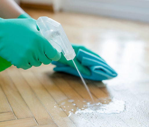 汚物(嘔吐物)が床や周辺に付着した場合は、嘔吐物処理専用の使い捨て手袋とマスクを着用し、直接触れないように注意します。嘔吐物を紙やペーパータオルなどで丁寧に取り除いた後、嘔吐物が付着した床やその周辺を消毒液でしっかり拭き取ります。このとき、処理物が広がらないよう外側から内側に向かって拭き取るのがポイントです。