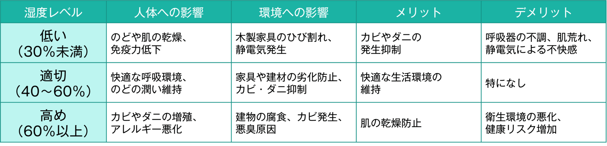 以下の表は、湿度のレベル別に人体や環境に与える影響とそのメリット・デメリットをまとめたものです。湿度管理の基準として参考にしてください。