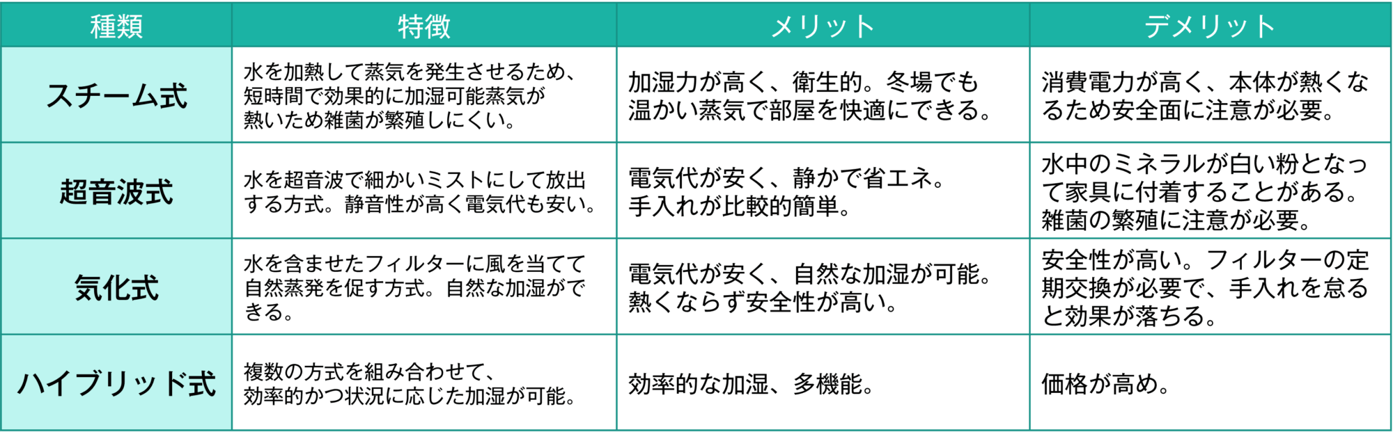 加湿器は主に4種類あり(機能を組み合わせたハイブリッド式を含む)、それぞれ加湿の仕組みや特徴が異なります。環境や目的に合った加湿器を選ぶために、まずは各種類の基本的な特徴とメリット・デメリットを理解しましょう