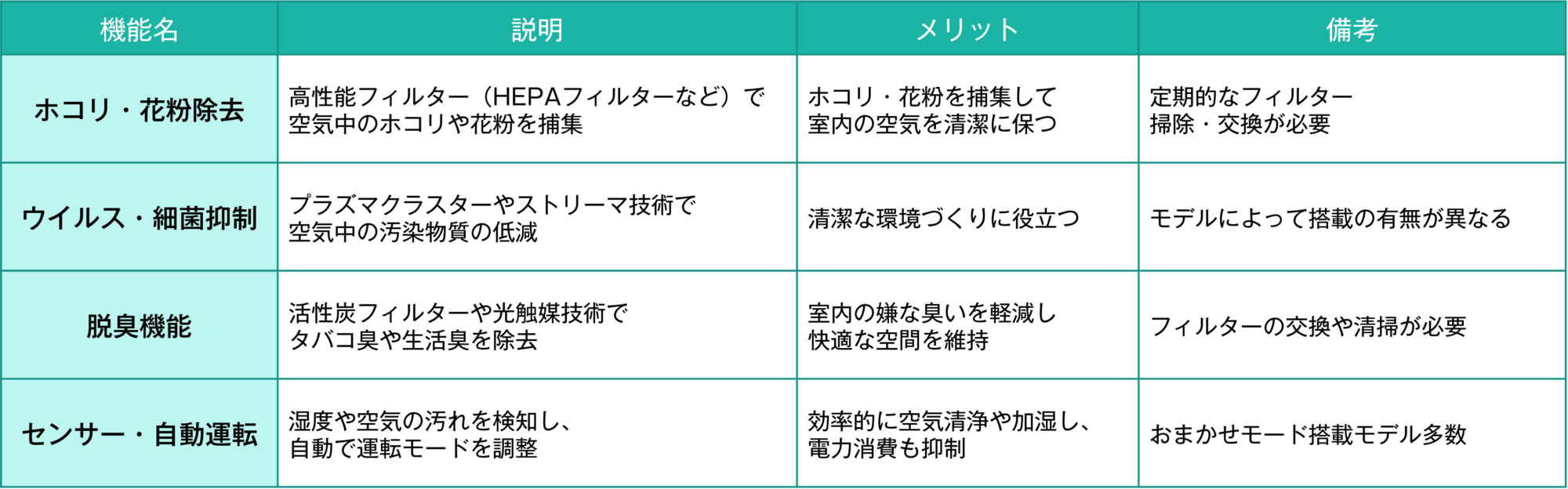 空気清浄機は、室内の空気を清潔に保ち、快適な環境をサポートするために多様な機能を備えています。近年では、単なるホコリ除去だけでなく、ウイルスや細菌の抑制、脱臭、加湿機能との連携など、より高度で便利な機能が充実しています。ここでは、空気清浄機の主な機能を表にまとめてわかりやすく紹介します。