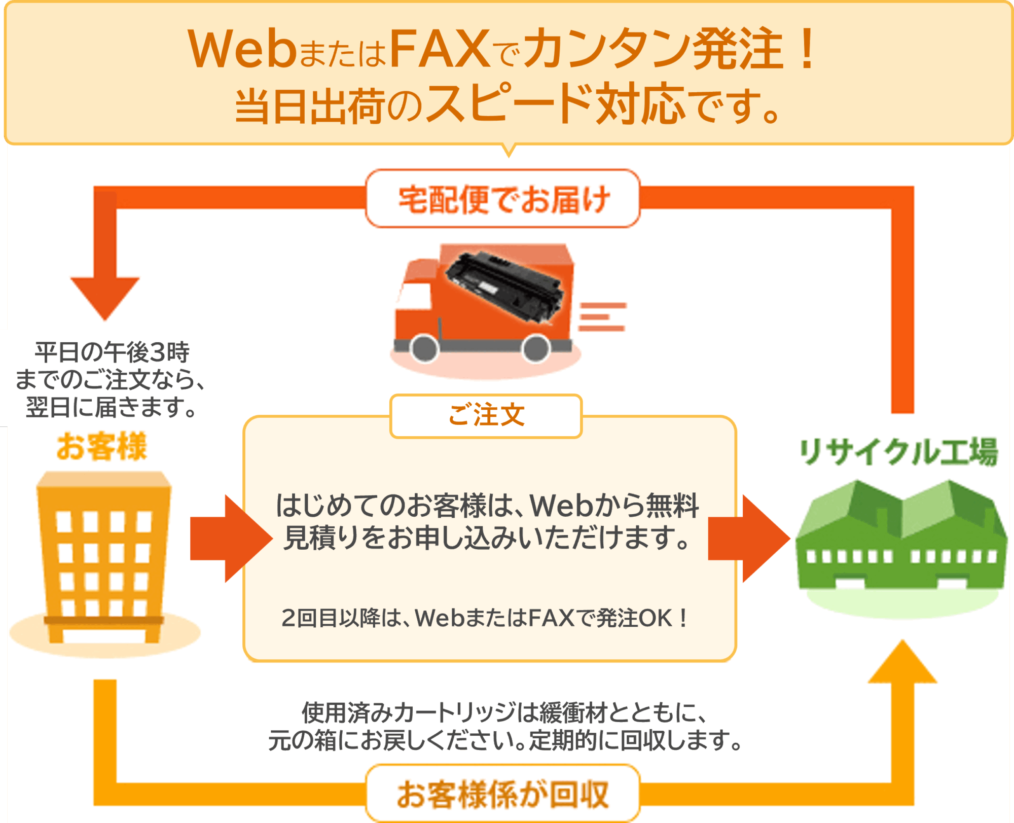 はじめてのお客様はWEBからお申し込みください。ダスキンのお客様係がお電話の上、訪問させていただきます。2回目以降はお客様専用Webサイトでのお申し込み、もしくはオーダーシートで必要事項をご記入いただきFAXにて送信ください。平日の午後3時までにしていただければ、その日のうちにトナーカートリッジの出荷が可能です。ご注文日の翌日には、お客様のお手元に届きます。