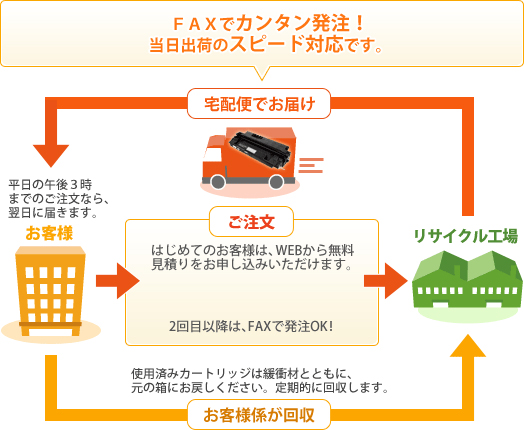 はじめてのお客様はWEBからお申し込みください。ダスキンのお客様係がお電話の上、訪問させていただきます。2回目以降はオーダーシートに必要事項をご記入いただき、平日の午後3時までにFAXしていただければ、その日のうちにトナーカートリッジの出荷が可能です。ご注文日の翌日には、お客様のお手元に届きます。