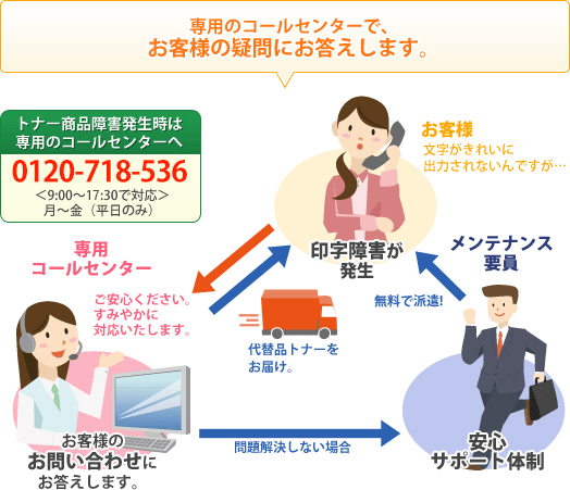 約500機種以上のプリンターに対応できる豊富な品揃え。トナー商品障害発生時にも専用のコンタクトセンターで対応。万一、代替品でも解決しなければ、メンテナンス要員が無料で対応します。