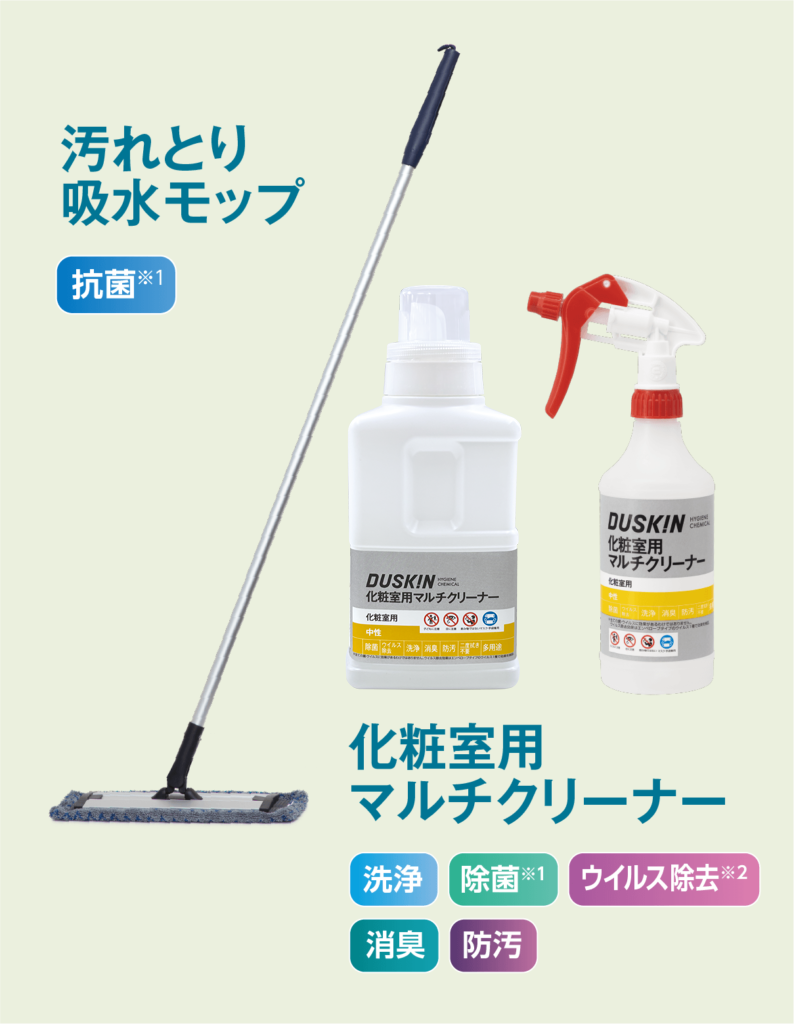 化粧室をキレイに保つためには、こまめなお掃除がなにより大切です。化粧室に設置してあるアイテムを活用すれば、トイレ利用時やアイドルタイムにサッとお掃除が可能。本格的なお掃除ができなくても、目立つ汚れを取るだけでも、キレイに差が出ます。